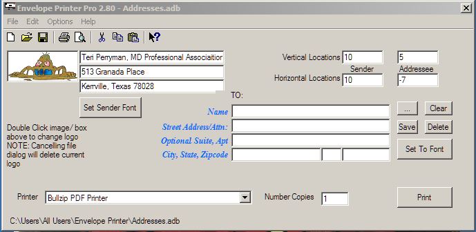 Again, the UserSet will include return address information, a bitmap/jpeg logo that will display/print to the left of the Return address, default font's to be used, default printer, envelope paper size, etc.  Each address in the address book will be associated to a UserSet.  Therefore, you could think of each UserSet as being it's own address book within the address book.  However, one address entered under one UserSet will not be available for printing under a different UserSet.  The address would have to be entered into each UserSet in order to be present in that UserSet's list of addresses.  I am thinking about providing an option that will allow the use of "independent" address books by UserSet to be turned on and off.  If turned off, then all addresses will be associated with all UserSets and the UserSet would not be used as another filtering mechanism.  If turned on, then the UserSet is just another filtering mechanism associating a specific return address to specific entries in the address book.